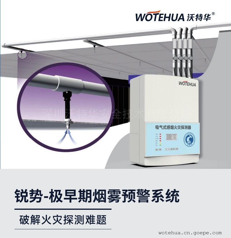 沃特华系列产品火灾预警技术提高了检测灵敏度,采用集成技术使产品性能更好,从而降低了产品制造成本、客户采购成本、用户的使用成本及售后的维护成本;沃特华系列极早期烟雾预警系统在研发阶段比较了各种不同的技术之后,使用了高功率红光LED为探测光源。其特点不仅可以满足高亮度、寿命长等对探测光源的基本要求,对尺寸较小的烟雾颗粒更为敏感,因此对所有尺寸的烟雾颗粒均能有效探测。